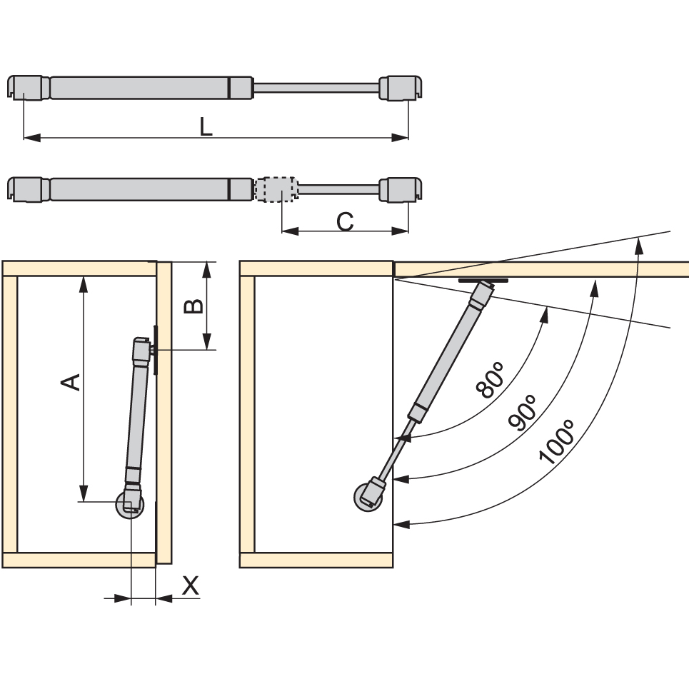 Amortecedor a gás Eco, para portas de madeira e de alumínio com espessura entre 16 a 19mm. Possibilidade de escolher o ângulo de abertura: 80º, 90º ou 100º. Para sobreposições de ilharga diferentes a 15mm, adicionar mais 15mm ao valor A.