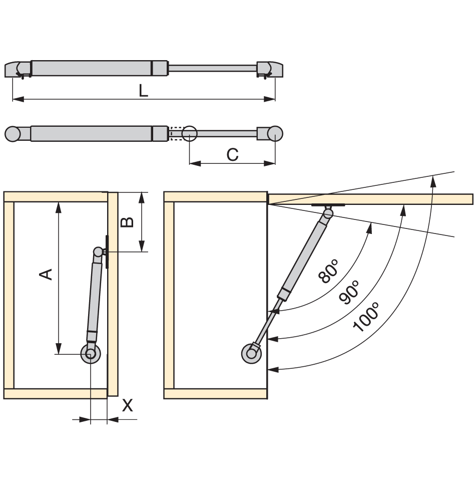 Amortecedor a gás para portas de madeira e de alumínio com espessura entre 16 a 19mm (e dobradiça reta de copo com sobreposição da ilharga de 15mm). Para sobreposições de ilharga diferentes de 15mm, adicionar mais 15 mm ao valor A. Para portas de largura superior a 450mm, usar 2 amortecedores.
