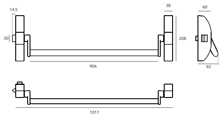 Barra anti-pânico reversível para porta de 1 folha. Fecho através de trinco lateral. Sem funcionamento através do exterior.