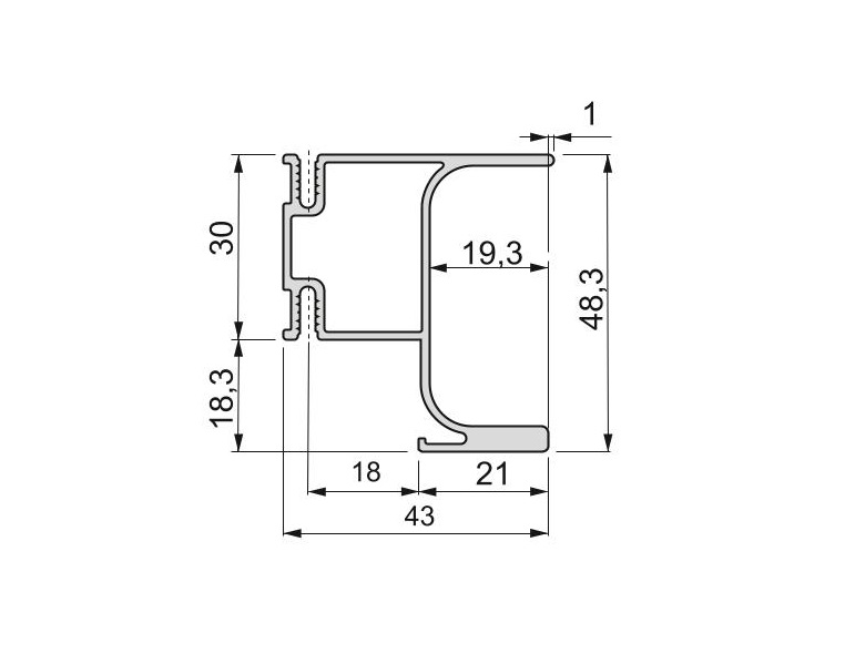 Perfil vertical lateral para a montagem de frentes de cozinha em despensas e armários, em alumínio.