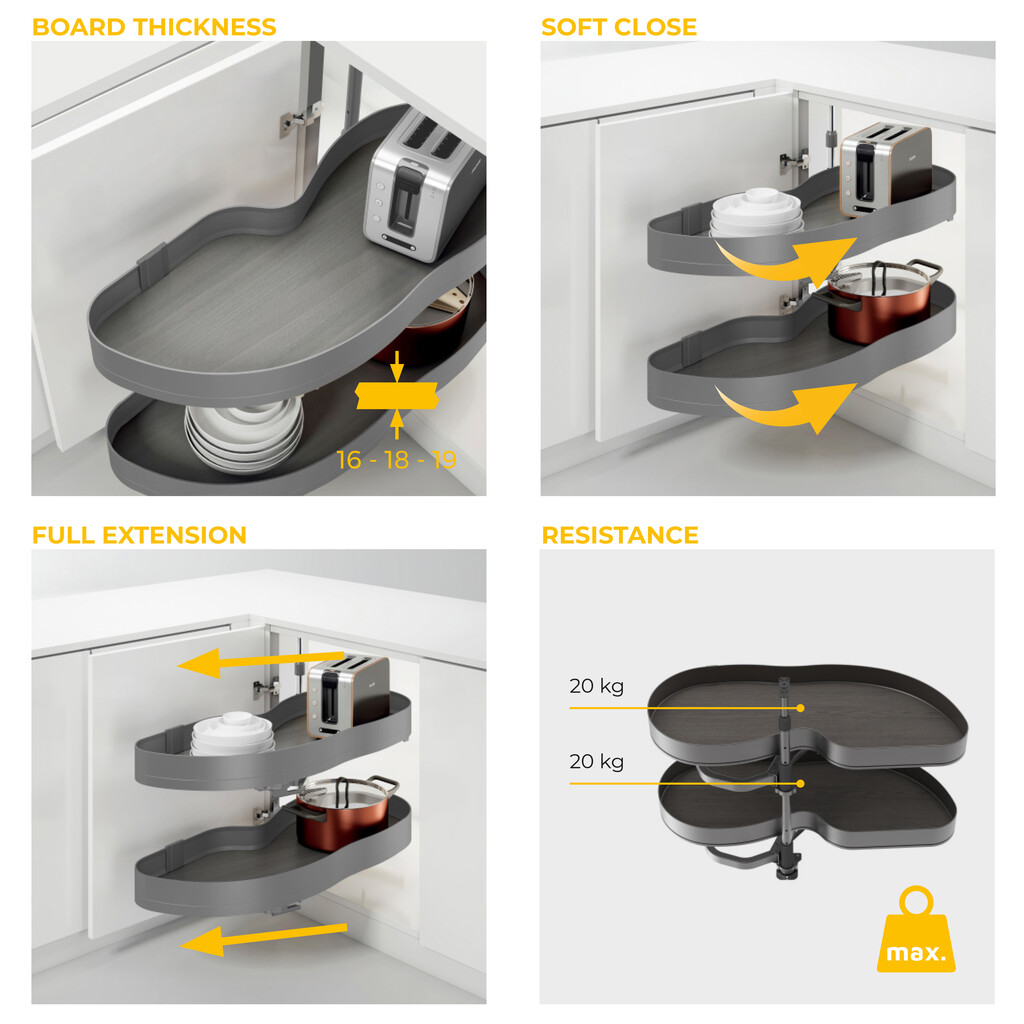 Sistema de canto extraível com fecho suave para móveis de canto de cozinha, concebido para arrumação e fácil acesso a utensílios, alimentos ou pequenos eletrodomésticos. Dispõe de duas prateleiras independentes reguláveis em altura, com uma capacidade de carga de 20 kg por cada prateleira (2 x 20 kg).