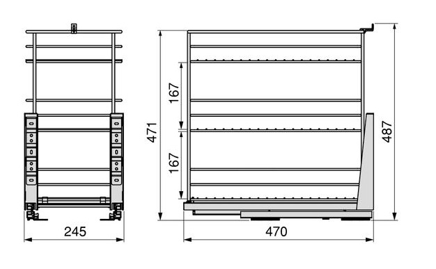Carrinho extraível com fixação inferior e fecho suave. Inclui estrutura com cestos, jogo de corrediças extraíveis e parafusos de fixação.