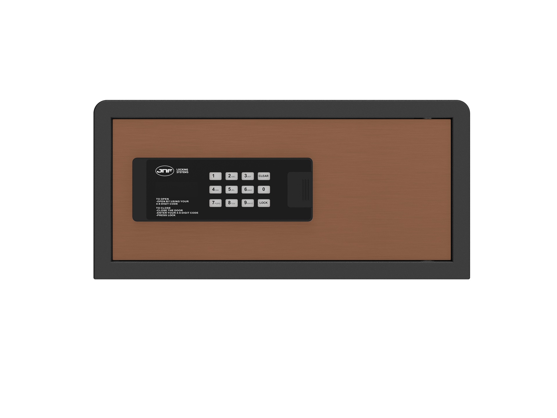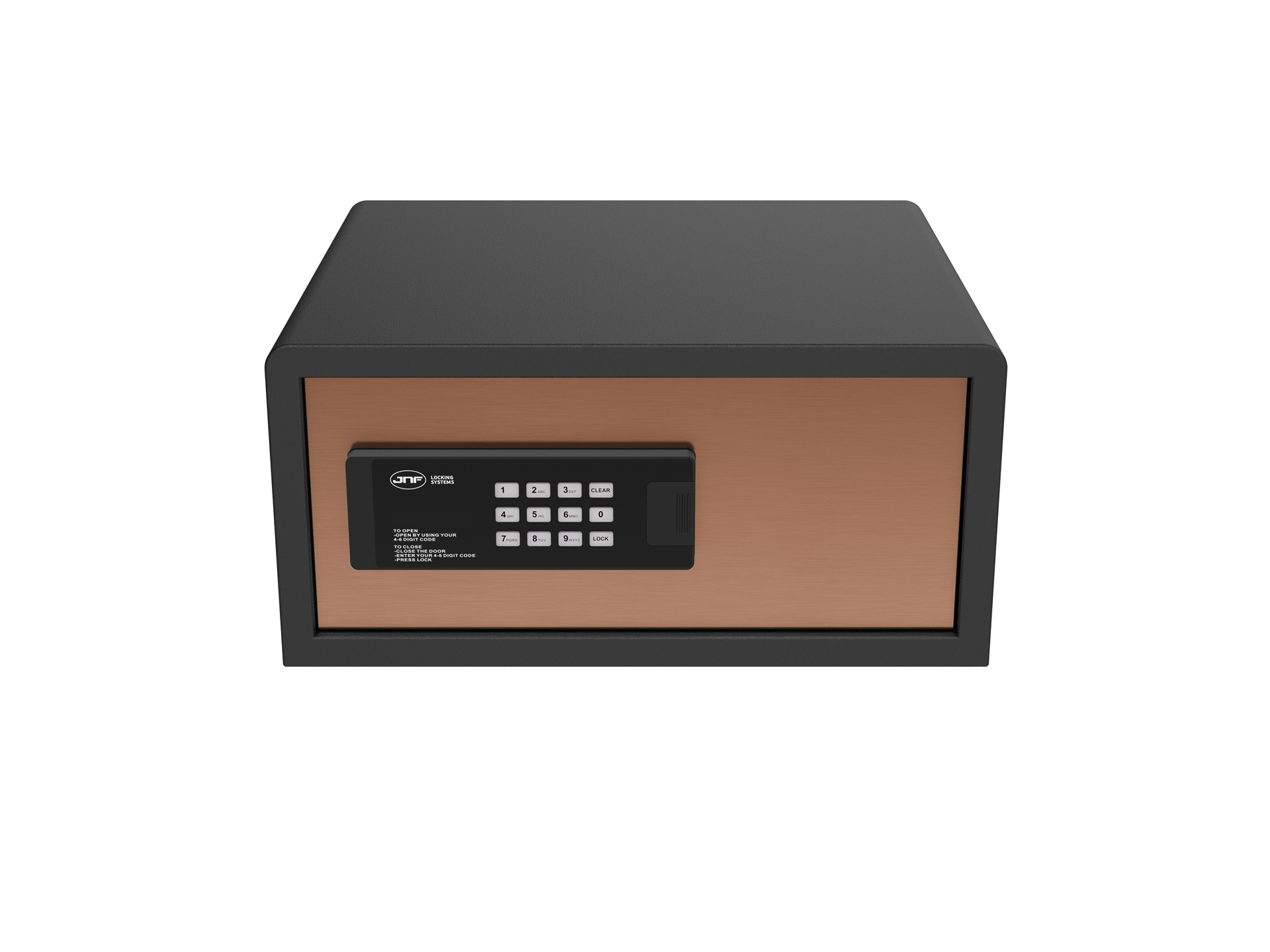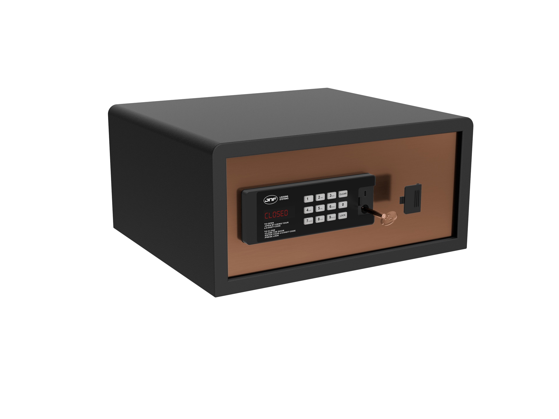 Cofre eletrónico digital para hotel, com teclado numérico analógico iluminado. Equipado com visor LED e código digital de 4 a 6 dígitos, oferece uma utilização simples e intuitiva, combinando um design sofisticado com elevada segurança.