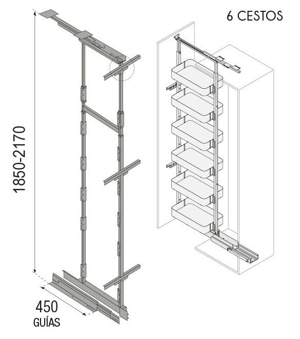 Coluna despenseiro de altura 1850-2170mm com 6 cestos com capacidade de 12kg cada. Para espessuras de 16 a 19mm. Corrediças sincronizadas, de fecho suave.