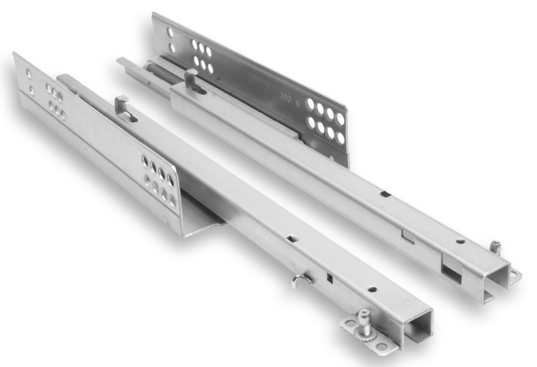 Corrediças ocultas de extração parcial com amortecedor, para gavetas de madeira.
