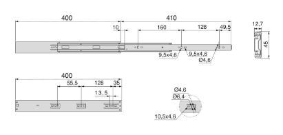 Corrediças com rolamentos de rolamentos e extração total da gaveta.Altura 45 mm.Carga máxima por Jogo de 35 kg.Dispõem de um pistão amortecedor em ambas corrediças, que proporciona um fecho suave da gaveta.