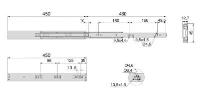 Corrediças com rolamentos de rolamentos e extração total da gaveta.Altura 45 mm.Carga máxima por Jogo de 35 kg.Dispõem de um pistão amortecedor em ambas corrediças, que proporciona um fecho suave da gaveta.