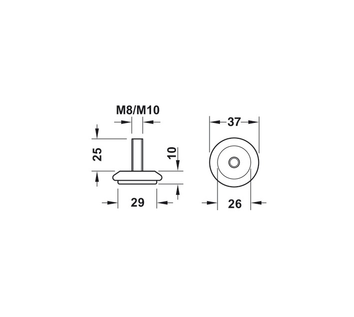 Pé ajustável com deslizador, com pino roscado rígido ou com base articulada, preto, M10, rígido.