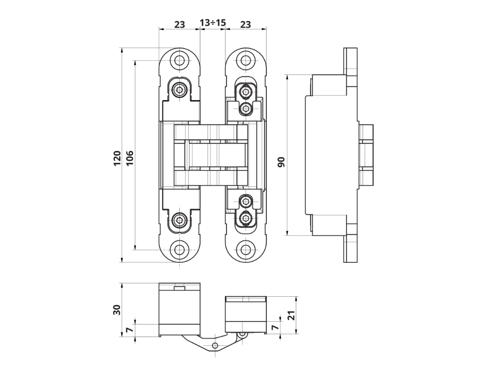 Dobradiça invisível e reversível com ajusta 3D. Para madeira e alumínio.