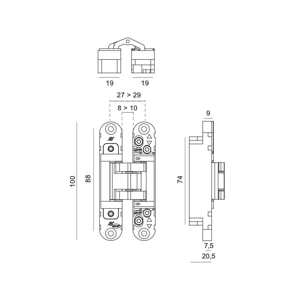 Dobradiça oculta coplan, afinação 3D, compatível com mola aérea.