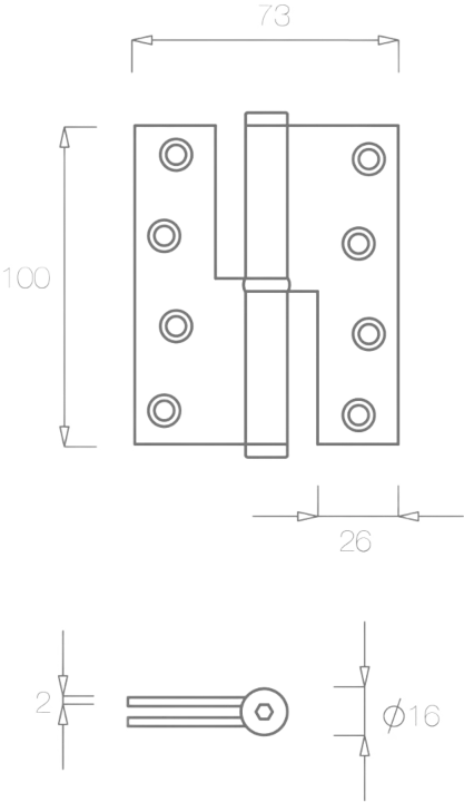 Dobradiça de mola com dupla função para portas de interior.