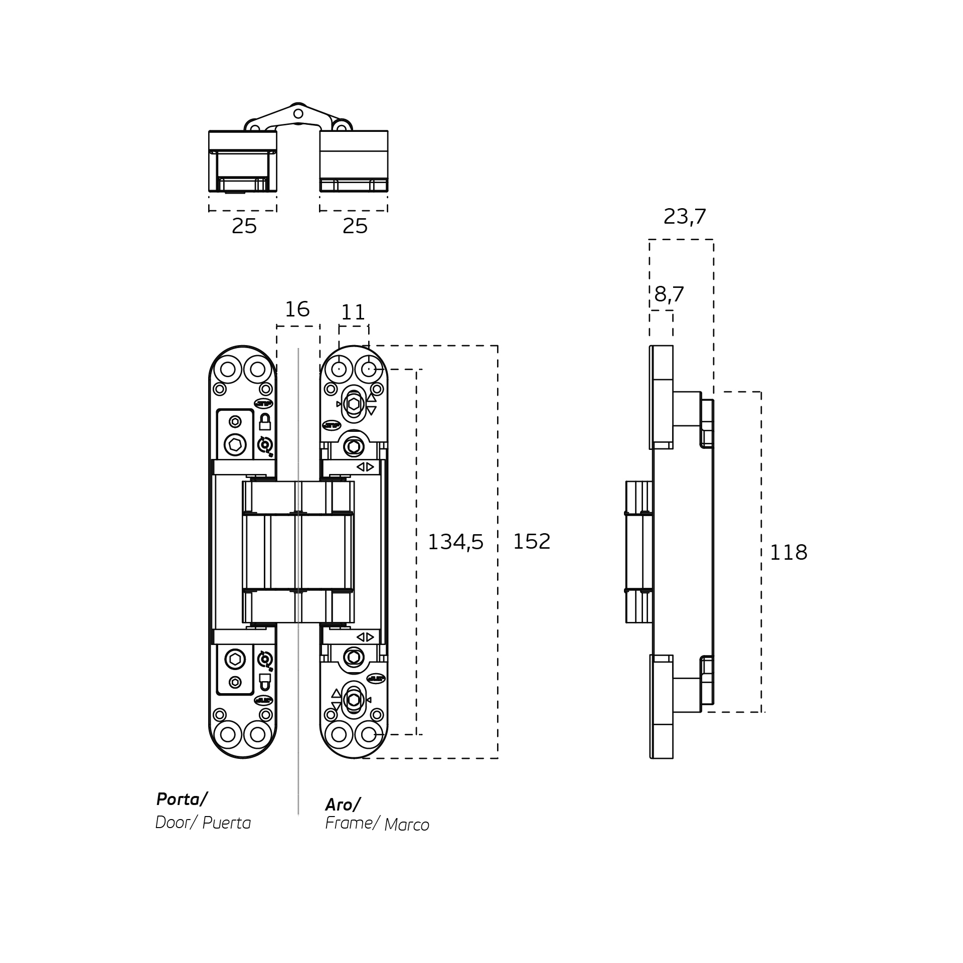 Dobradiça oculta coplan, afinação 3d, espessura mínima de porta 31 mm, compatível com mola aérea.