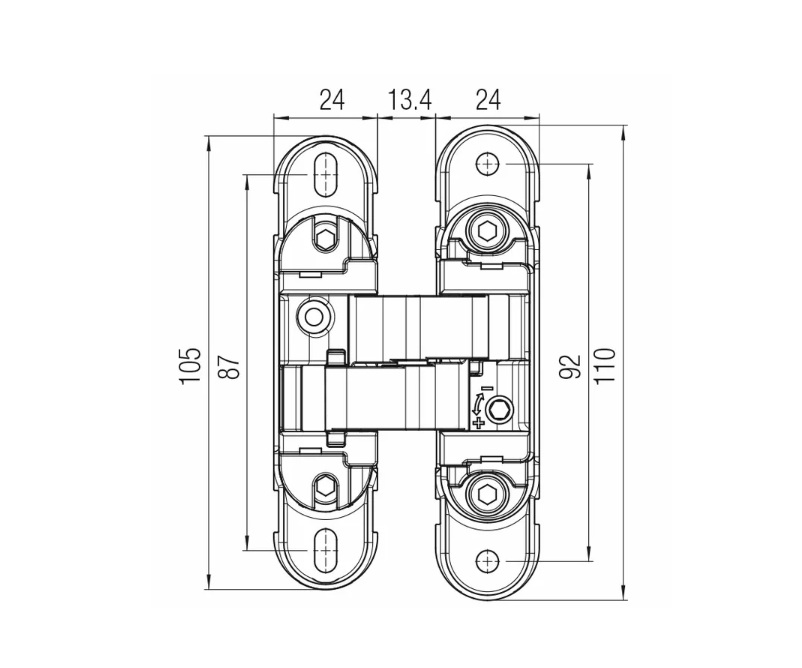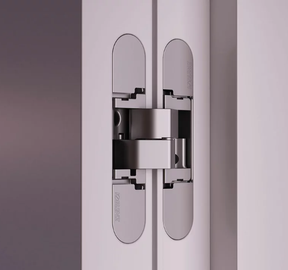 Dobradiça invisível com ajuste 3D em material híbrido (aço, plástico acetal e zamak). Capacidade de 40kg com 2 dobradiças. Adequado para estrutura de madeira, alumínio e aço.