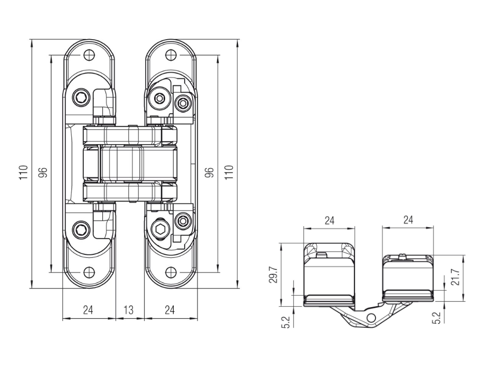 Dobradiça invisível 3D. Capacidade de carga de 60 kg com 2 dobradiças.