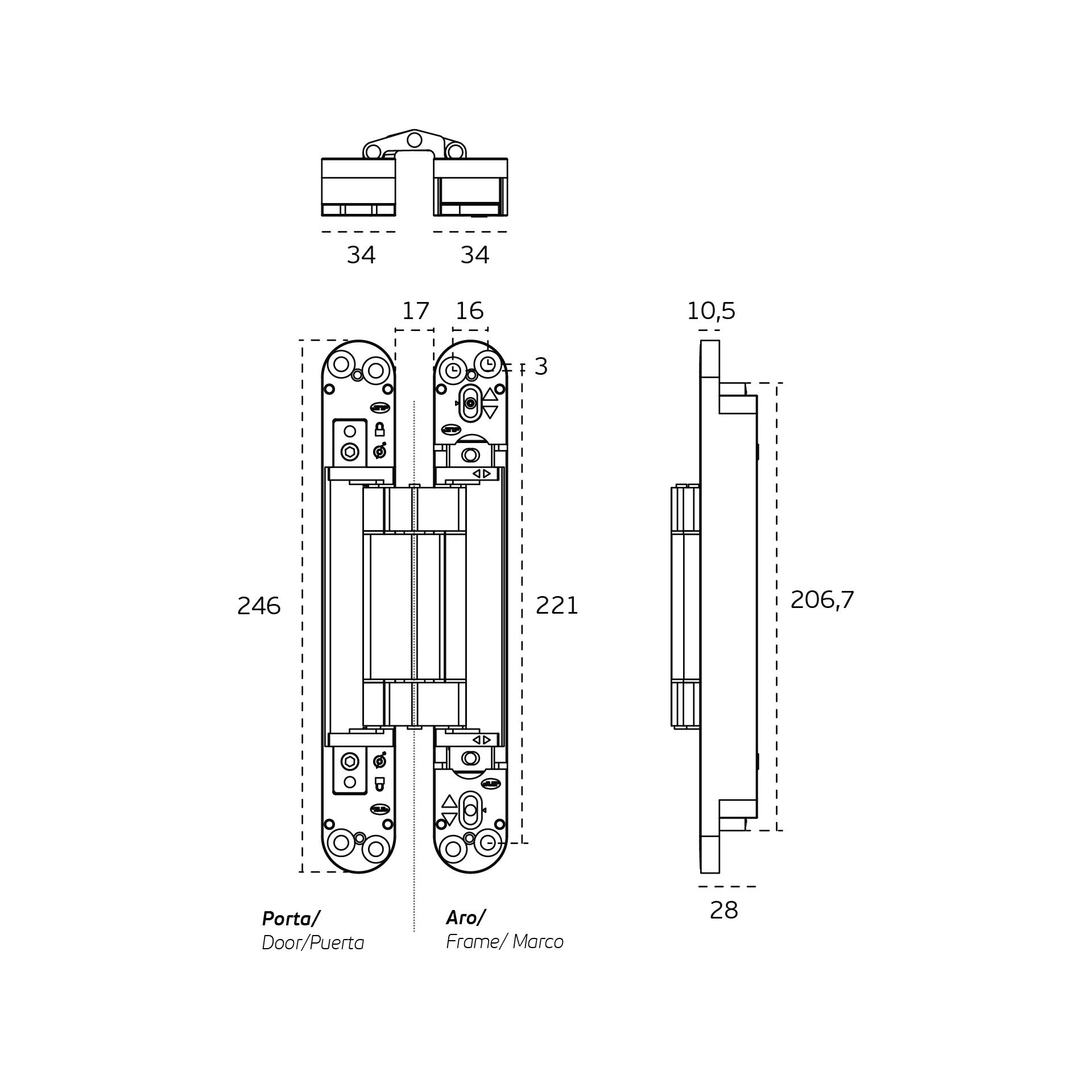 Dobradiça oculta coplan, afinação 3D, espessura mínima de porta 40 mm, compatível com mola aérea.