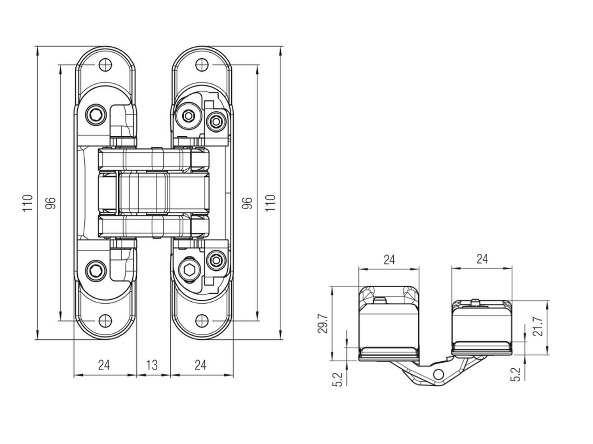 Dobradiça invisível 3D. Capacidade de carga de 60 kg com 2 dobradiças.