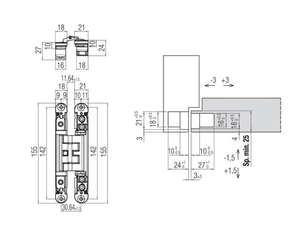 Dobradiça invisível regulável KUBICA K2460 HYBRID. Fabricada em zamak, tem capacidade para 60Kg com 2 dobradiças.
