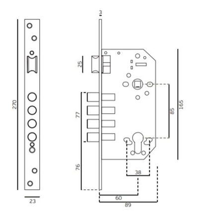 Fechadura de alta segurança.Quadra em aço inox com mola interior para eliminação da folga entre o puxador e a quadra.Frente em inox escovado apenas 23mm de largura e 3mm de espessura.Chapa testa 2,5mm de espessura.