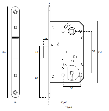 A folga do trinco em relação à chapa testa é ajustável em +1mm / -1mm pela rotação de 180º