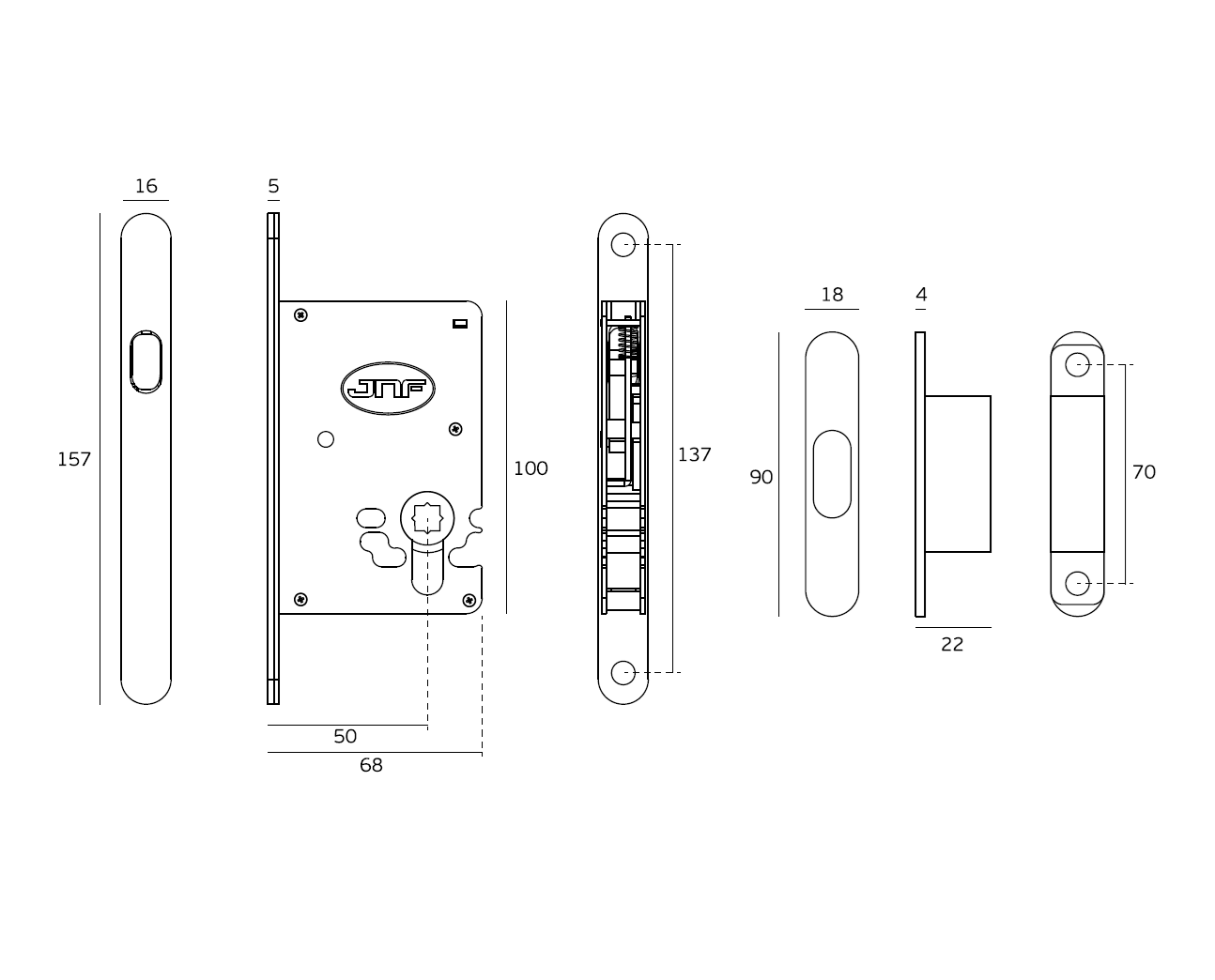 Fechadura de embutir para portas de correr. Fornecida com conjunto de puxadores de embutir.