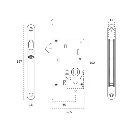 Fechadura de embutir para portas de correr. Gancho, frente e chapa testa em aço inox EN 1.4301.