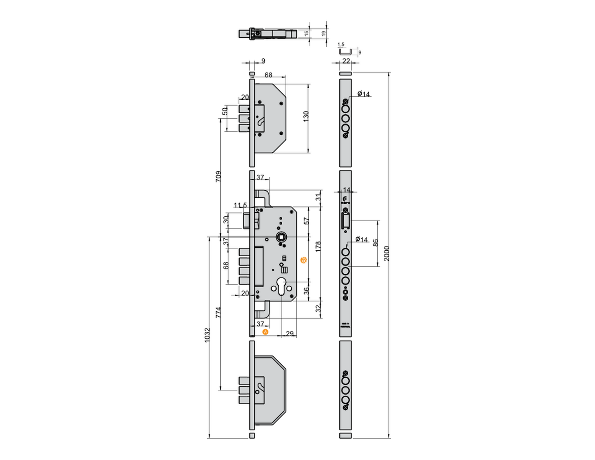 Fechadura de segurança de três pontos de fecho com entrada cilindro a 60mm. Fornecida com espelho de segurança, cilindro E500 de segurança com cinco chaves, escudo do cilindro ESP102, chapas testa e material de fixação.