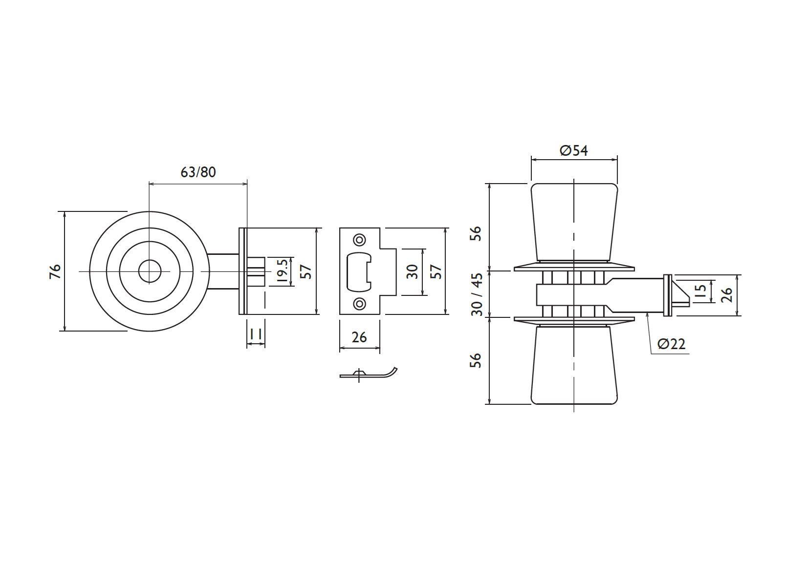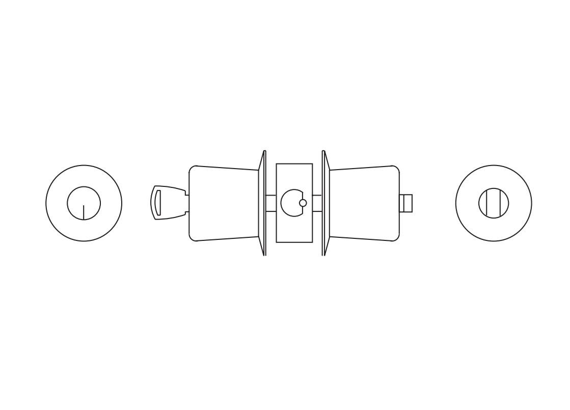 Fechadura tubular chave-botão. Trincos de segurança acionado pelo puxadores de ambos os lados, exceto quando bloqueados pela chave do exterior ou pelo botão do interior.