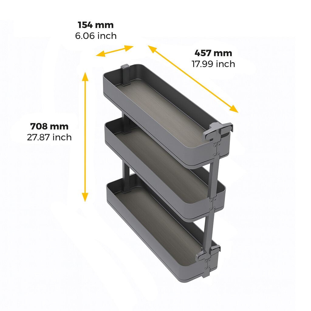 Garrafeira lateral extraível com 3 cestos, concebida para maximizar a arrumação e aproveitar o espaço nos móveis de cozinha. Equipada com corrediças ocultas de extensão total com fecho suave, capacidade de carga de 25 kg – ideal para aceder facilmente a garrafas, latas, frascos e outros produtos de cozinha.