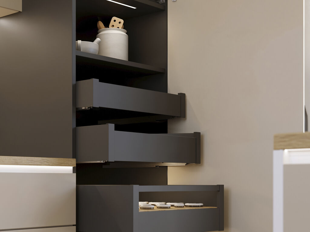 A gaveta de cozinha e banho Protone está disponível em formato kit com todas as ferragens necessárias para a sua montagem. Inclui corrediças de extracção total com fecho suave, jogo de engates e ilhargas de gaveta.