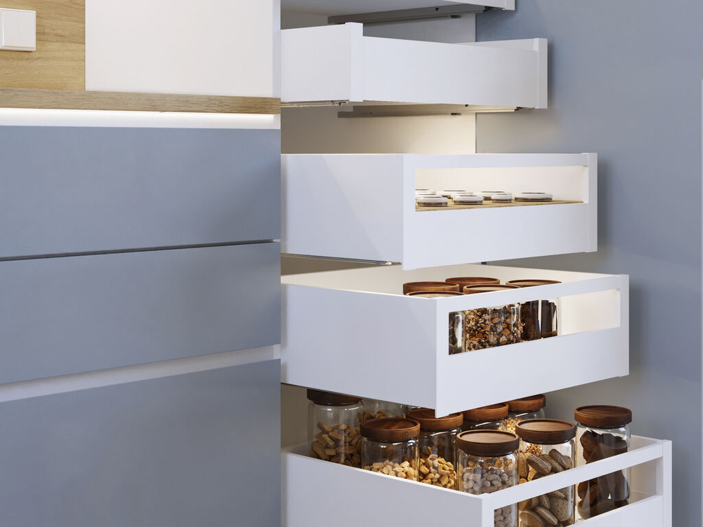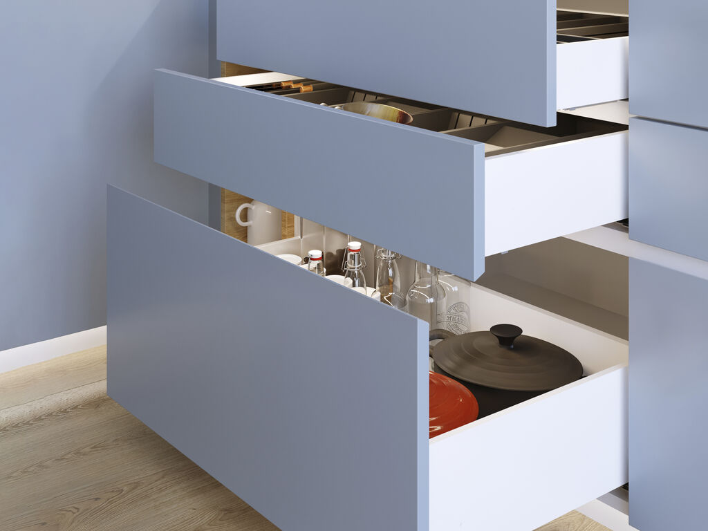 A gaveta de cozinha e banho Protone está disponível em formato kit com todas as ferragens necessárias para a sua montagem. Inclui corrediças de extracção total com fecho suave, jogo de engates e ilhargas de gaveta.