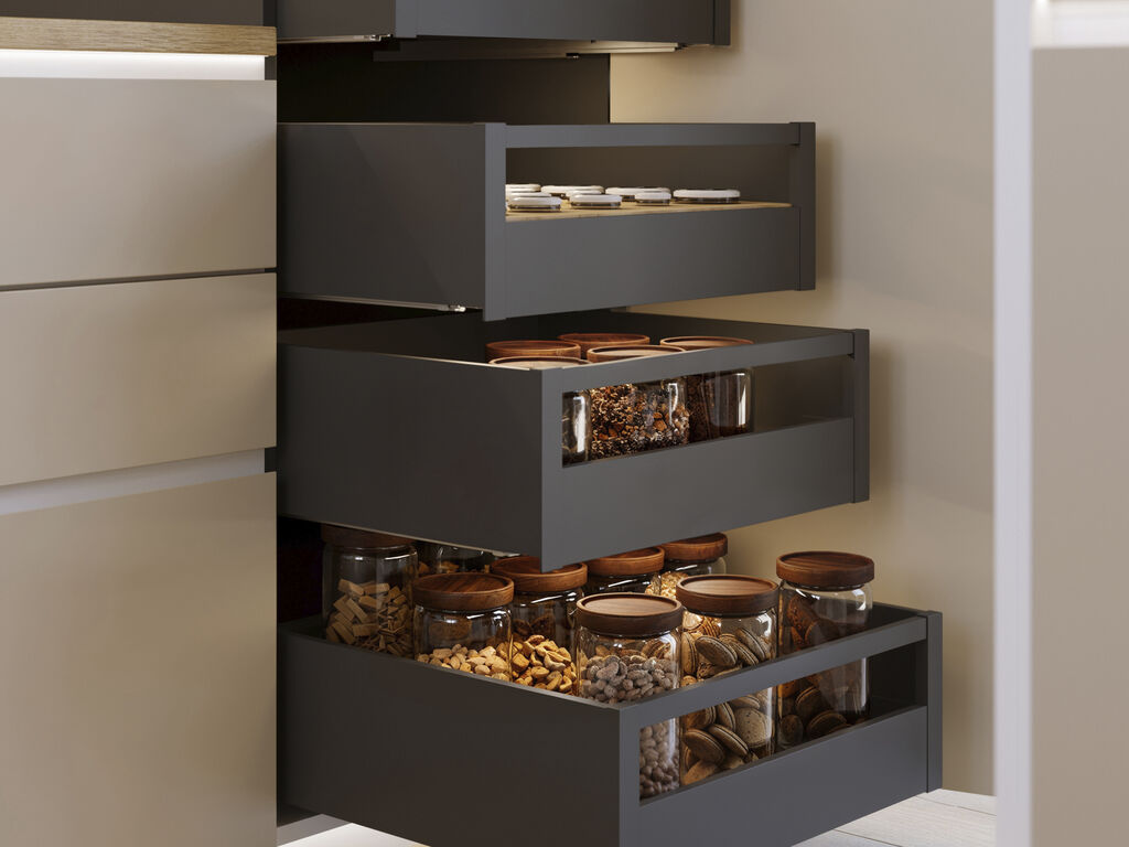 A gaveta de cozinha e banho Protone está disponível em formato kit com todas as ferragens necessárias para a sua montagem. Inclui corrediças de extracção total com fecho suave, jogo de engates e ilhargas de gaveta.