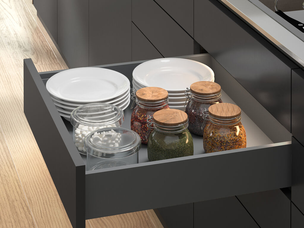 Gaveta exterior Vertex com Push Syncro e regulação 3D, altura 131mm , 40kg. Em aço pintado antracite.