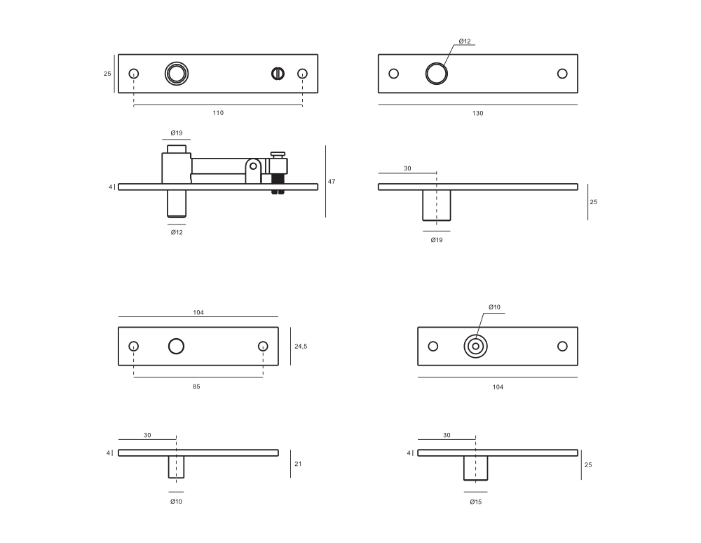 Giro para portas de batente ou “vai e vem”, espessura mínima de porta 35 mm, 100 kg, inox.