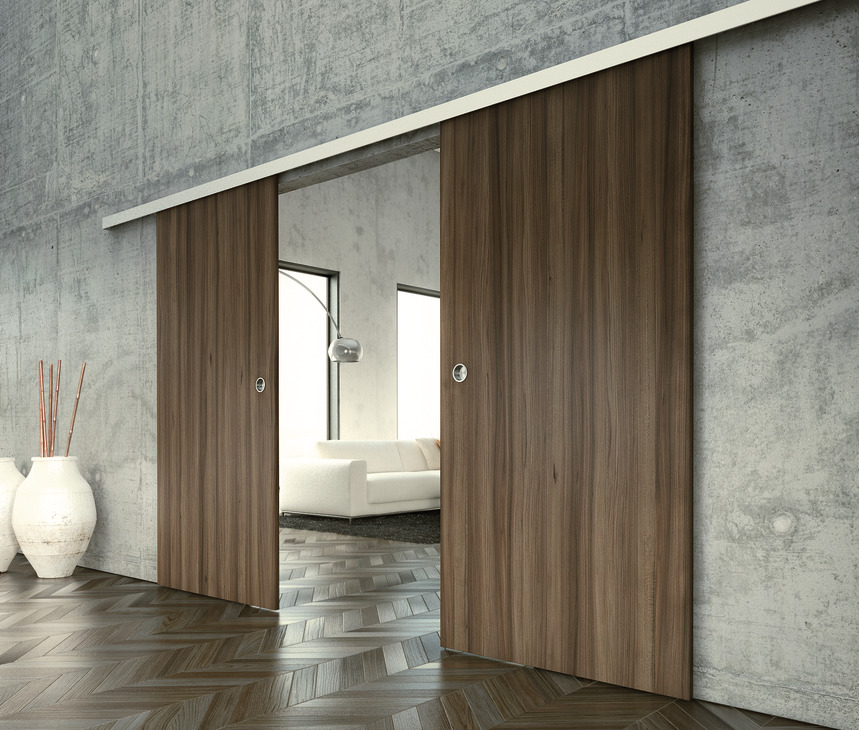 Ferragem para porta de correr, Slido Classic 40-120-O, conjunto para portas de correr em madeira de 1 e 2 folhas, instalação na parede e no teto, mecanismo de fecho automático e de fecho suave, portas de altura regulável, para pesos de porta até 40–120 kg