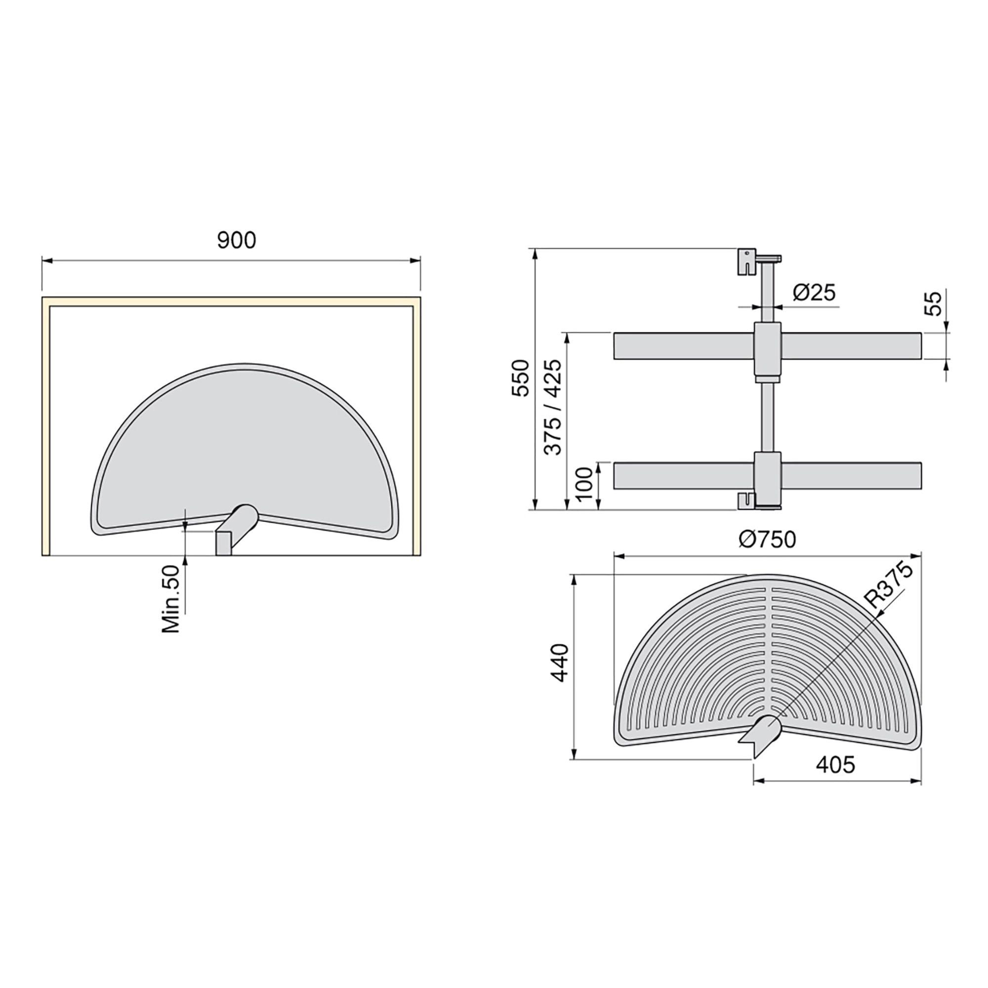 Travessas giratórias de meia-lua desenhadas para aproveitar o espaço em móveis de canto de cozinha em forma de L. Carga de 20 kg por travessa.
