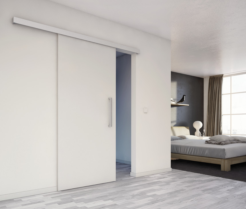 Ferragem para porta de correr, Häfele Slido D-Line11 80I, conjunto sem calha, para portas de correr em madeira de 1 folha, instalação no teto e montagem na parede, altura de porta ajustável, para peso da porta até 80 kg, com mecanismo de fecho automático e de fecho suave de um lado, largura de porta ≥538 mm