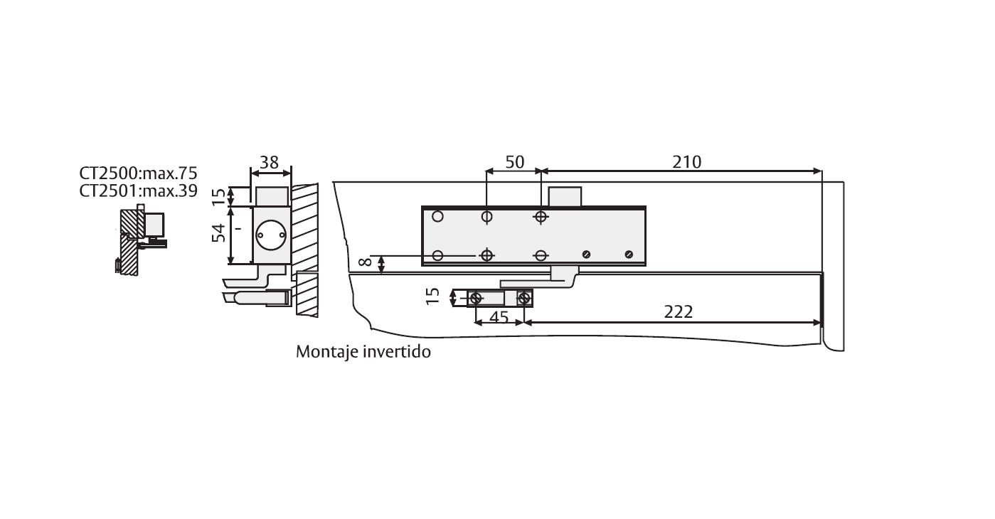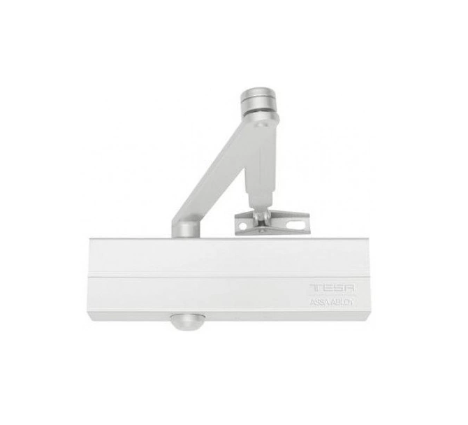 Mola de braço articulado para portas de até 1100mm de largura e um peso de 80kg. Três válvulas de regulação, duas delas permitem regular a velocidade de fecho e a terceira oferece um freio à abertura. Regulação de velocidade de fecho e de golpe final. Reversível.