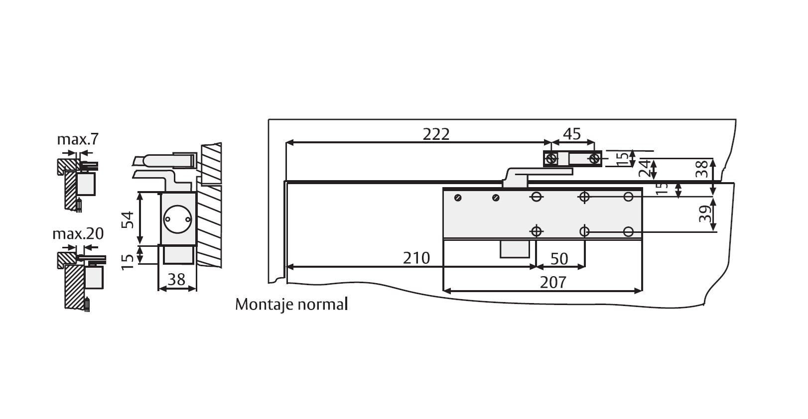 Mola de braço articulado para portas de até 1100mm de largura e um peso de 80kg. Três válvulas de regulação, duas delas permitem regular a velocidade de fecho e a terceira oferece um freio à abertura. Regulação de velocidade de fecho e de golpe final. Reversível.