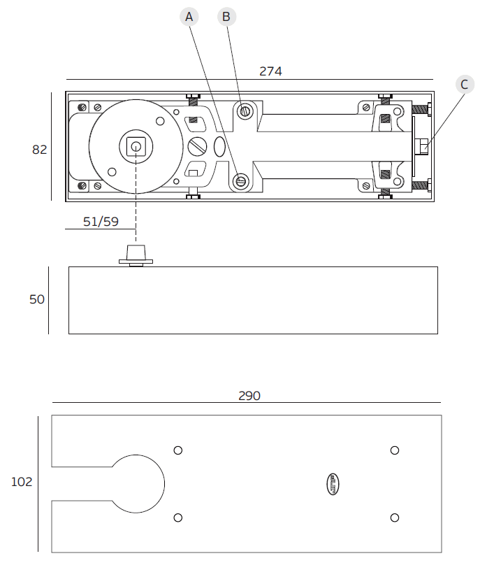 Mola de pavimento para portas de batente ou vai-vém aplicável em portas de madeira, metálicas ou de vidro, sem paragem.