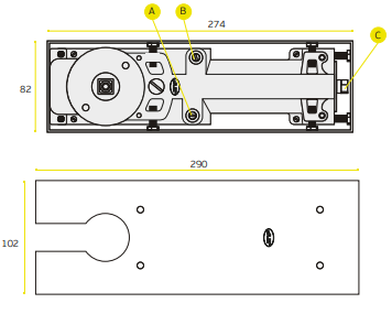 Mola de pavimento para portas de batente ou vai-vém aplicável em portas de madeira, metálicas ou de vidro, com paragem a 90º.