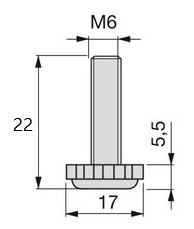 Nivelador para móveis, de regulação exterior. Com parafuso M6 e base hexagonal de plástico de cor preta.