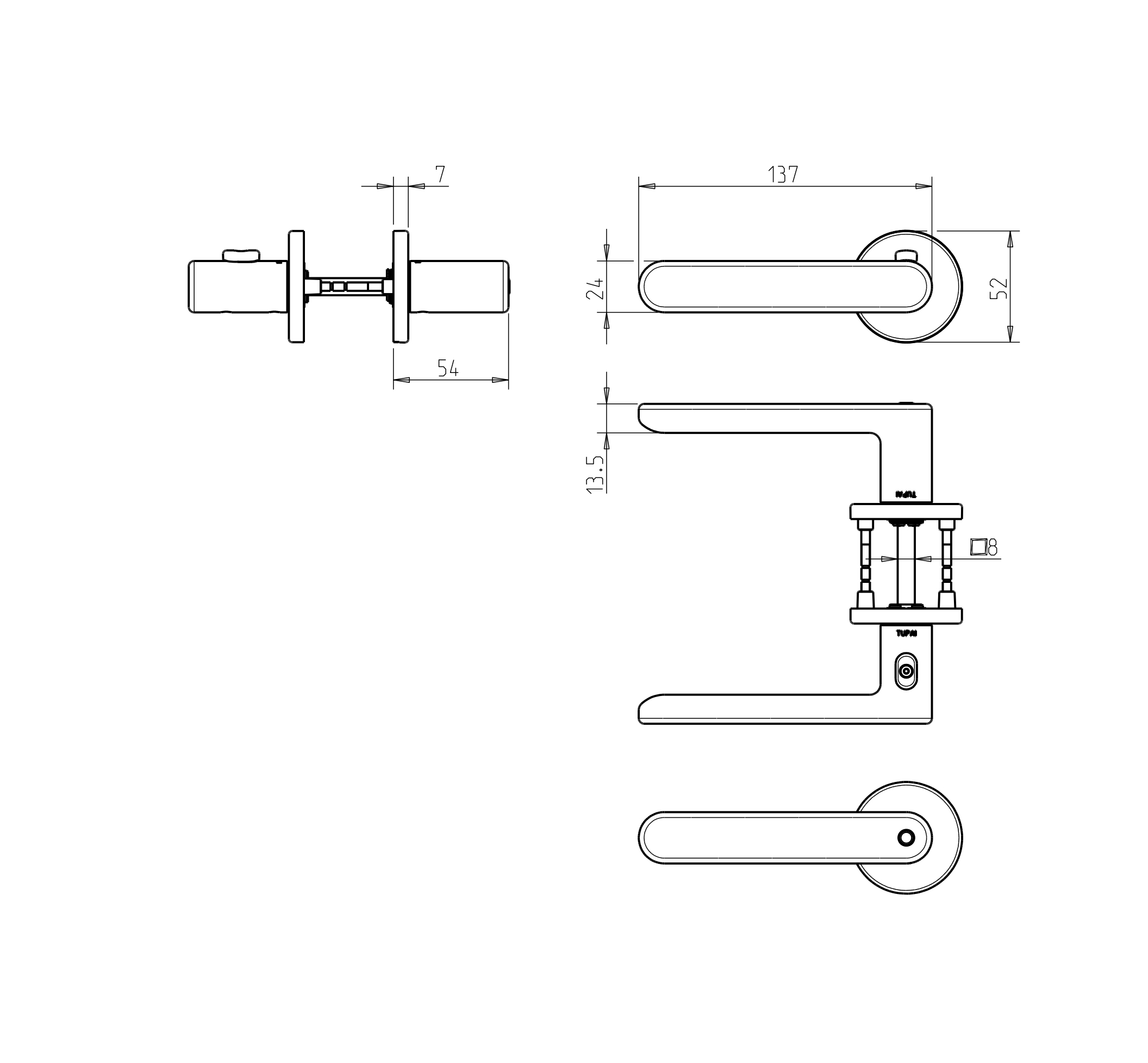 Puxador com mola recuperadora reversível, ferro quadrado 8mm e fixação da muleta com perno M6 oculto. Diferencia-se pelo inovador botão de privacidade que bloqueia discretamente a porta.
