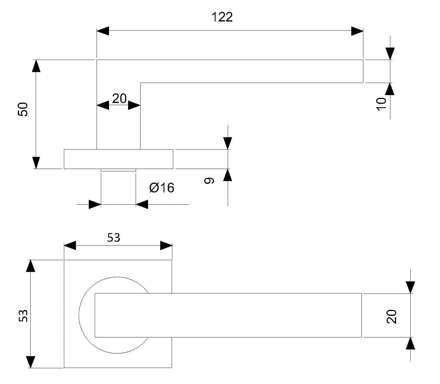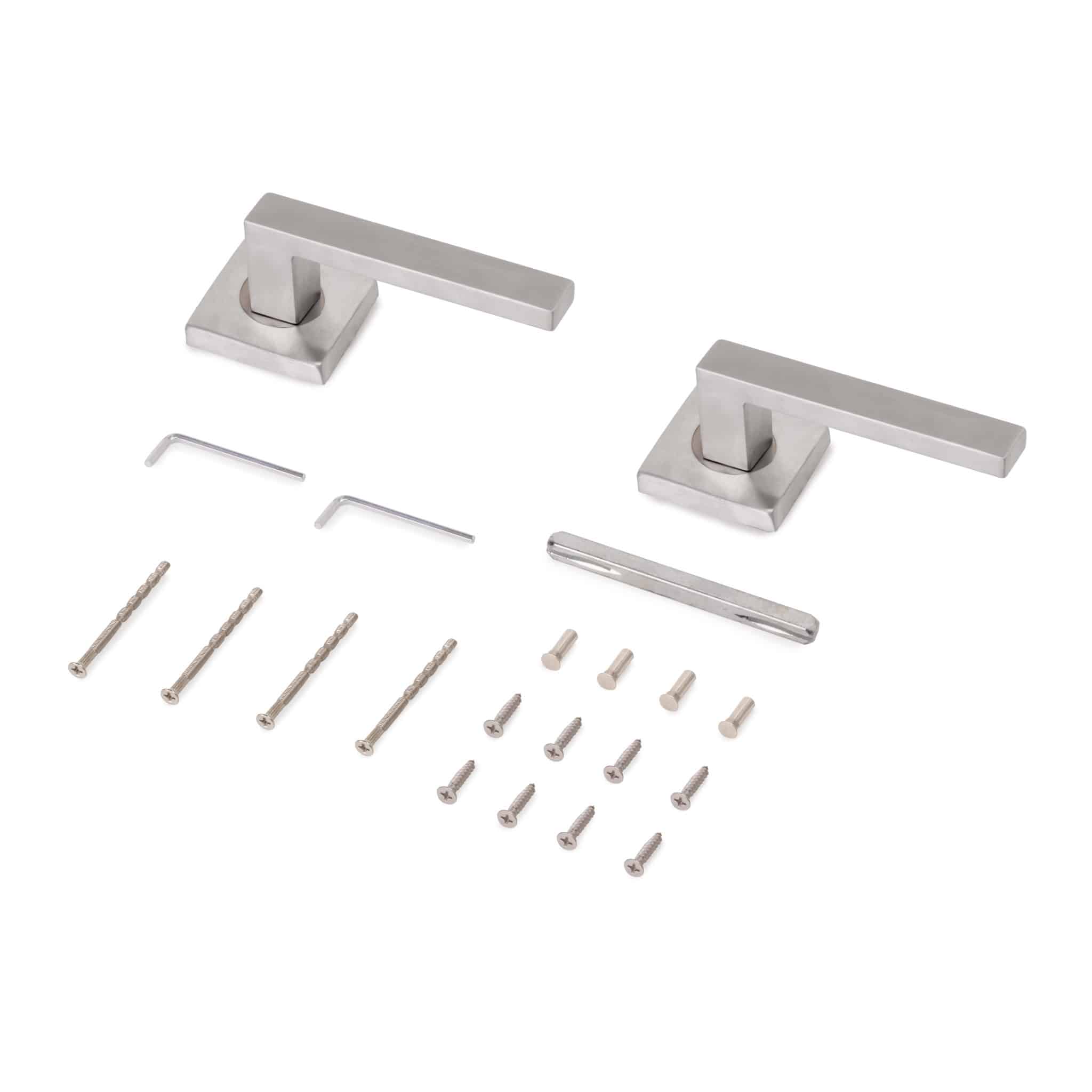 Par de puxadores em aço inoxidável AISI-304 com roseta quadrada de 53x53. Modelo Mackay para acionamento de fechaduras de embutir com encaixe quadrado de 8mm.