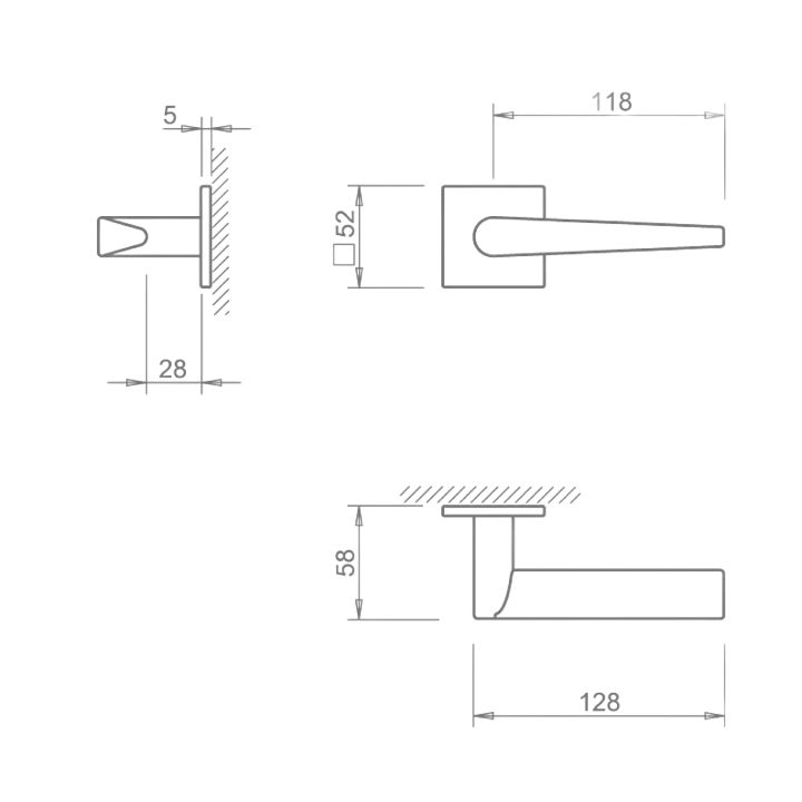 Puxador par. Adaptador com sistema “click”. Mola recuperadora. Ferro quadrado de 8x90mm. Fixação da muleta com perno M6 oculto.