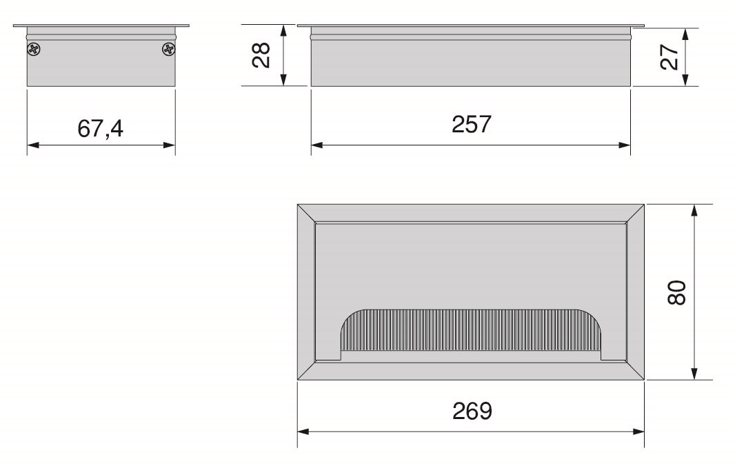 Passa-cabos retangular embutido para mesa.