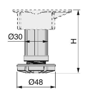 Pé nivelador para módulos inferiores de cozinha, fabricado em plástico preto. O diâmetro do suporte é de 30mm, com rosca interna. Conta com um ponto de apoio de 48mm de diâmetro.