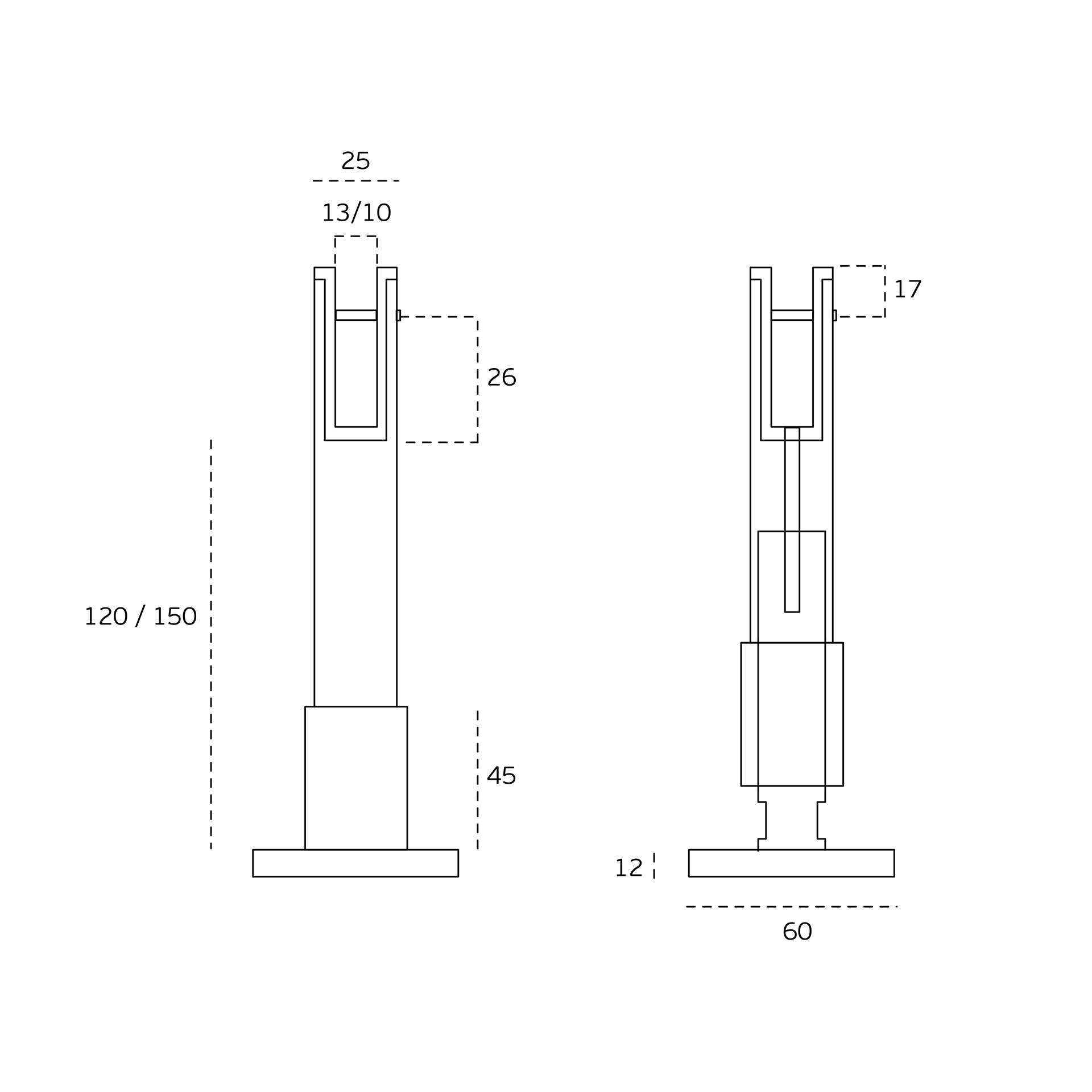 Base regulável para painel SM.017. Fixação ao solo através de uma sólida base metálica. O ajuste do suporte em altura é possível mesmo com a base já fixa ao solo e painel já instalado.