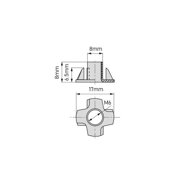 Porca dentada utilizada em pinos e pés niveladores de móveis. A porca M6 tem 17mm de largura e 9mm de diâmetro.