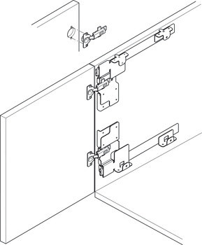 Sistema para 1 porta de recolher pequena dimensão. Para portas com peso até 14kg, altura até 1065mm, largura até 610mm e espessura 19 a 38mm. Fornecido com dobradiças de copo 40 e calços.