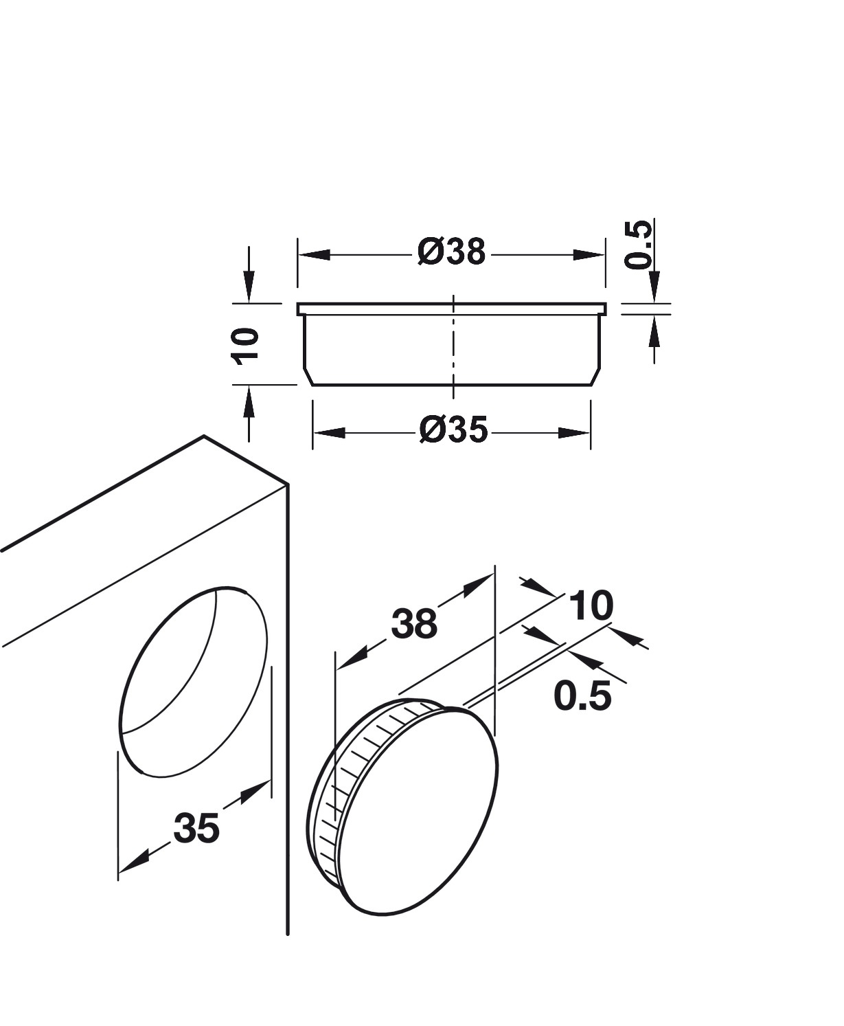 Tampa para embutir, para perfurações de copo. Para diâmetro de furo 35mm, com cabeça de 38mm.